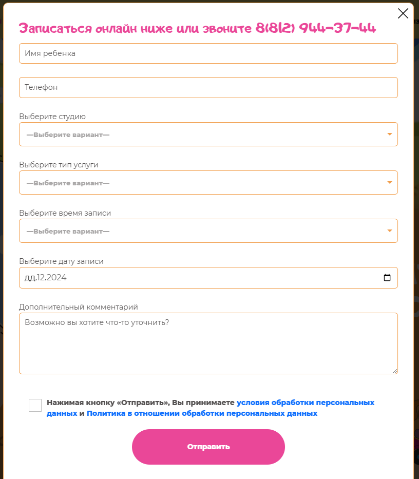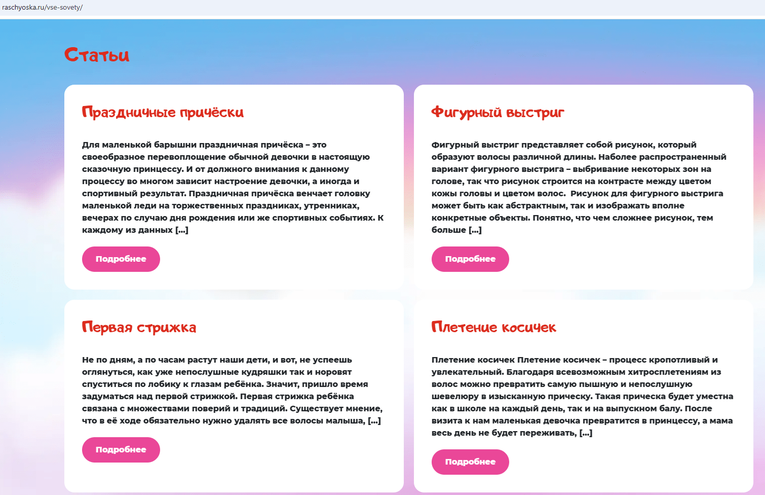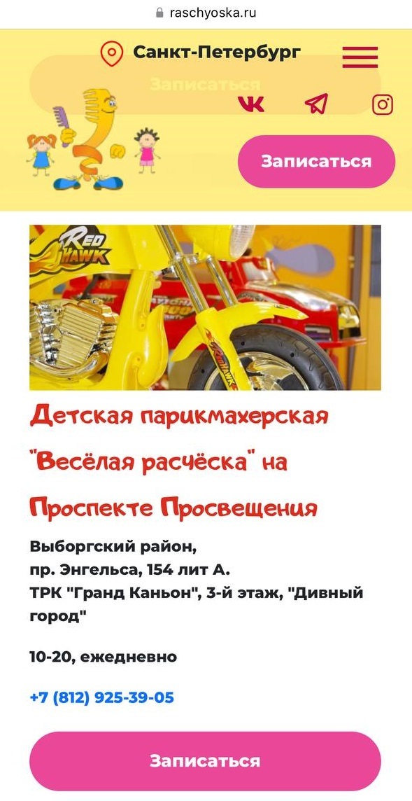 Благодаря данному решению, по статистике из Яндекс Метрики, 30% посетителей сайта, заходят в раздел "Контакты" и записывают ребёнка на стрижку. 20% кликают на кнопку "Записаться"