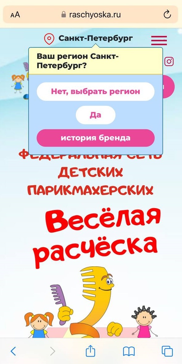 80% посетителей сайта заходят с мобильных, основная задача сайта - помочь потенциальному клиенту записать ребёнка на стрижку. Поэтому на экранах мобильных всегда фиксируется верхнее меню с кнопкой "Записаться", при нажатии на которую, в зависимости от региона, открывается либо страница с региональными адресами парикмахерских (Например, если клиент из Москвы, то он видит список московских парикмахерских) либо анкета с записью на стрижки